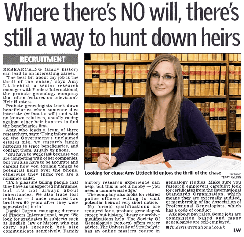 Finders International are always looking for talented individuals. If you, like Amy, also enjoy the thrill of the chase and reuniting long lost relatives – take a look at our careers page: http://www.findersinternational.co.uk/about/vacancies/